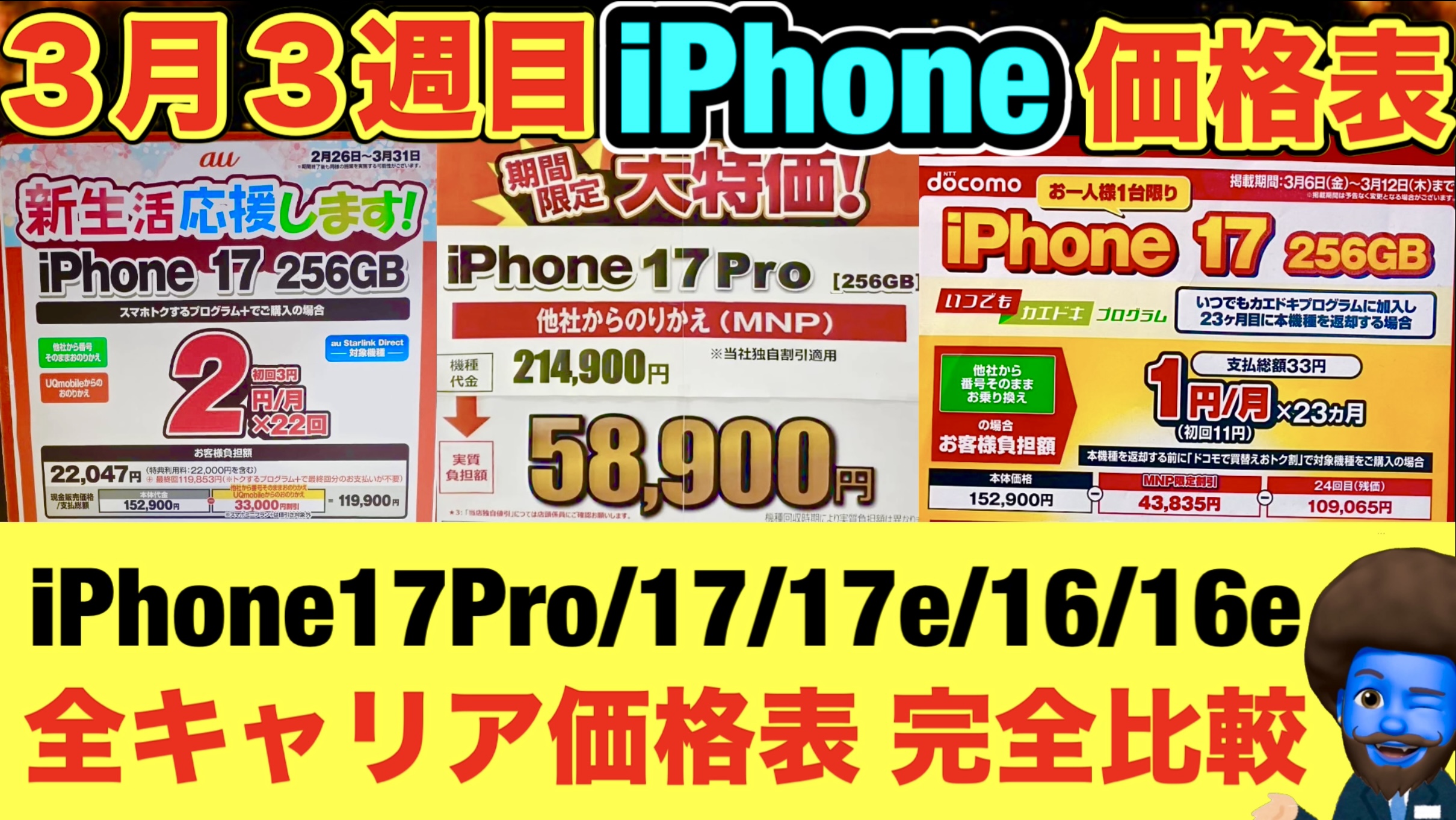 ついに価格が発表されたiPhone 17e。 「どうせMNPが一番お得でしょ」。そこまでは分かっている方も多いかもしれません。 でも、今回はそれだけじゃ足りません。 ソフトバンクは2025年から、そしてドコモ・auも2026年からついに、2年返却プログラムが『最大の改悪』をしました。 「月額1円だから」と飛びつくと、2年後に22,000円を請求される罠です。 さらに今回は、容量(256GB・512GB)によって最安キャリアが変わるという点も見逃せません。 この記事では両容量の価格をすべて比較し、あなたの使 ...