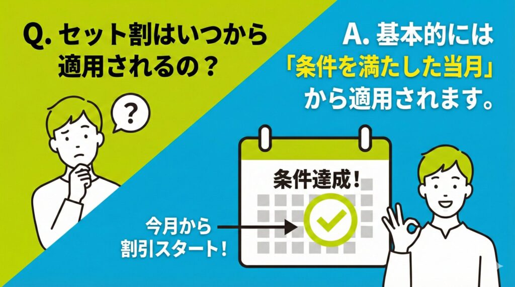 申し込み後に条件を満たした月から、すぐに割引がスタートします。