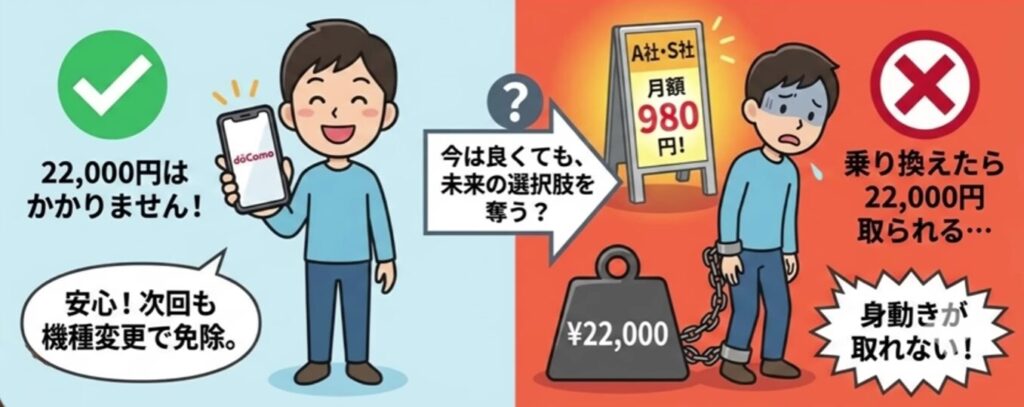 「次も同じキャリアで買う前提なら22,000円はかからない」は正しいのですが、2年後に他社がもっと良いプランを出しても自由に動けなくなります。