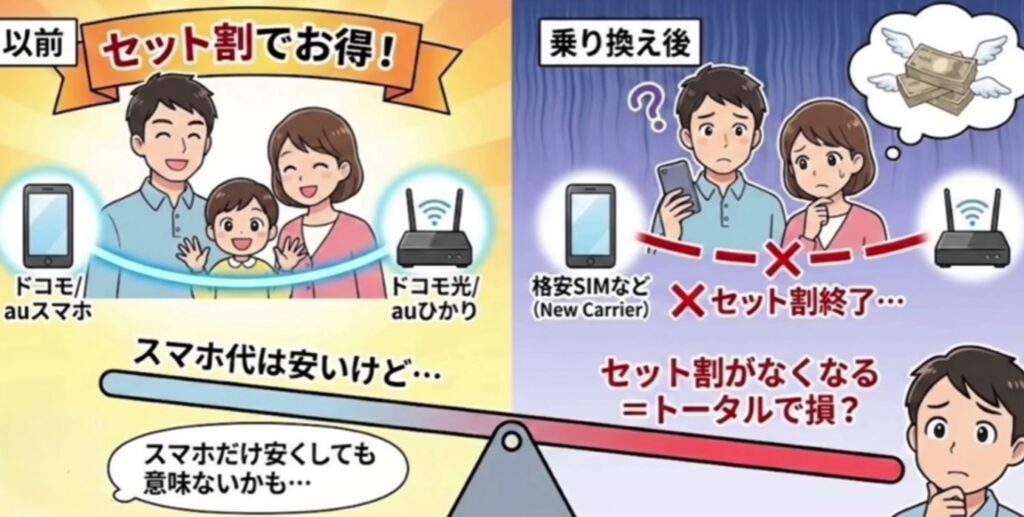 スマホを乗り換えながら光回線のセット割が消えても放置していると、月々の固定費は結局下がらないか、むしろ上がる可能性があります。