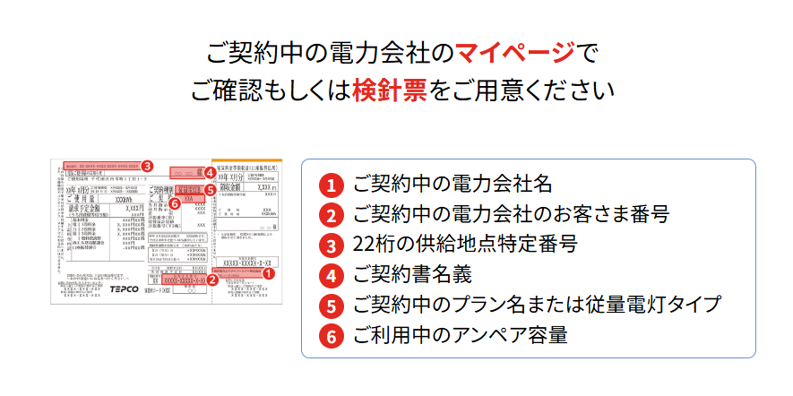 切り替えには、現在契約している電力会社の検針票やマイページに記載のある、22桁の供給地点特定番号などの情報が必要なので、準備しましょう。