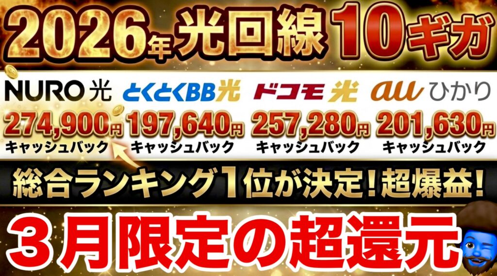 現在、1ギガ光回線の各社キャンペーンは過去最高水準に突入しています。