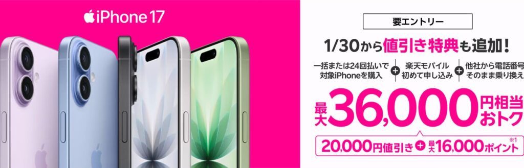 初めて乗り換える方には公式キャンペーンで最大36,000円相当、2回目以降の乗り換えの場合は「三木谷キャンペーン」で14,000ポイントが還元されます。
