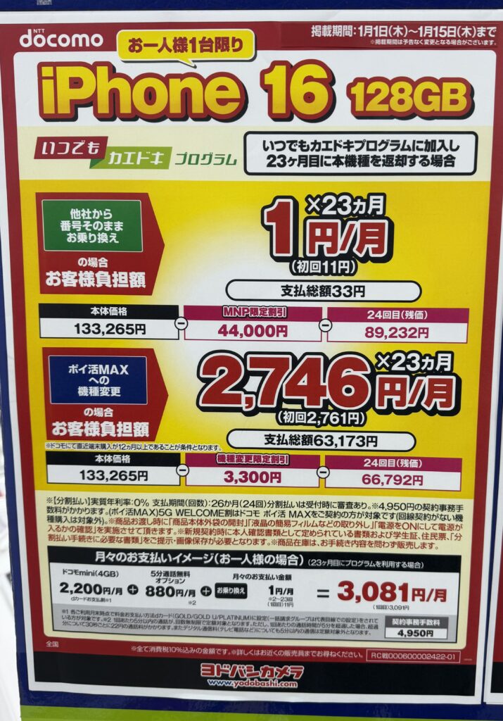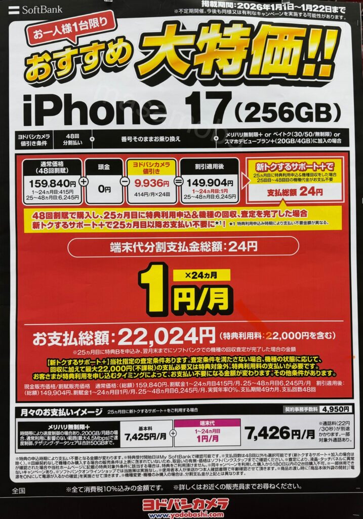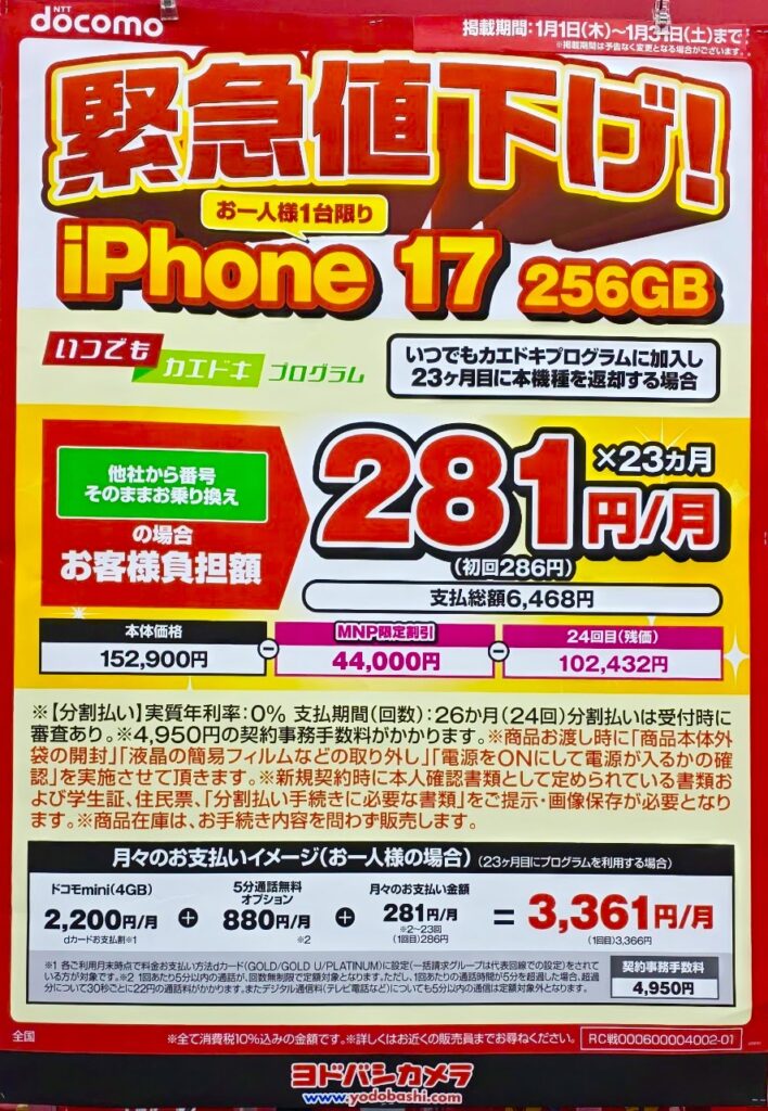 12/25~iPhone17ドコモ ahamoで2年返却がさらに安くなりました!価格とPOPを更新