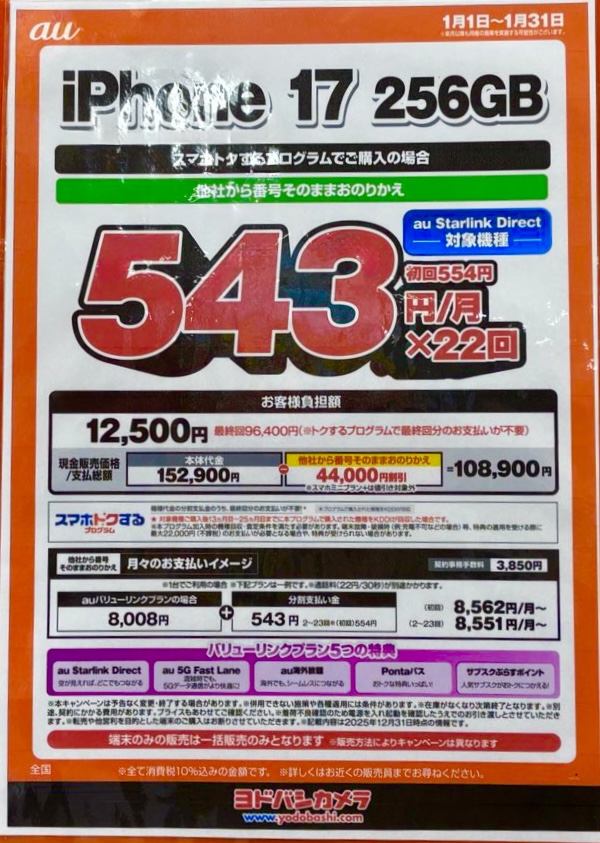 1/6~au iPhone17が2年返却が6,458➡︎12,510円に!価格とPOP更新