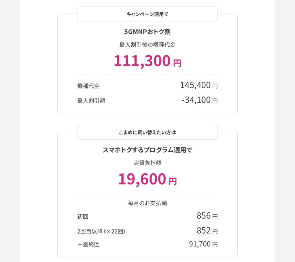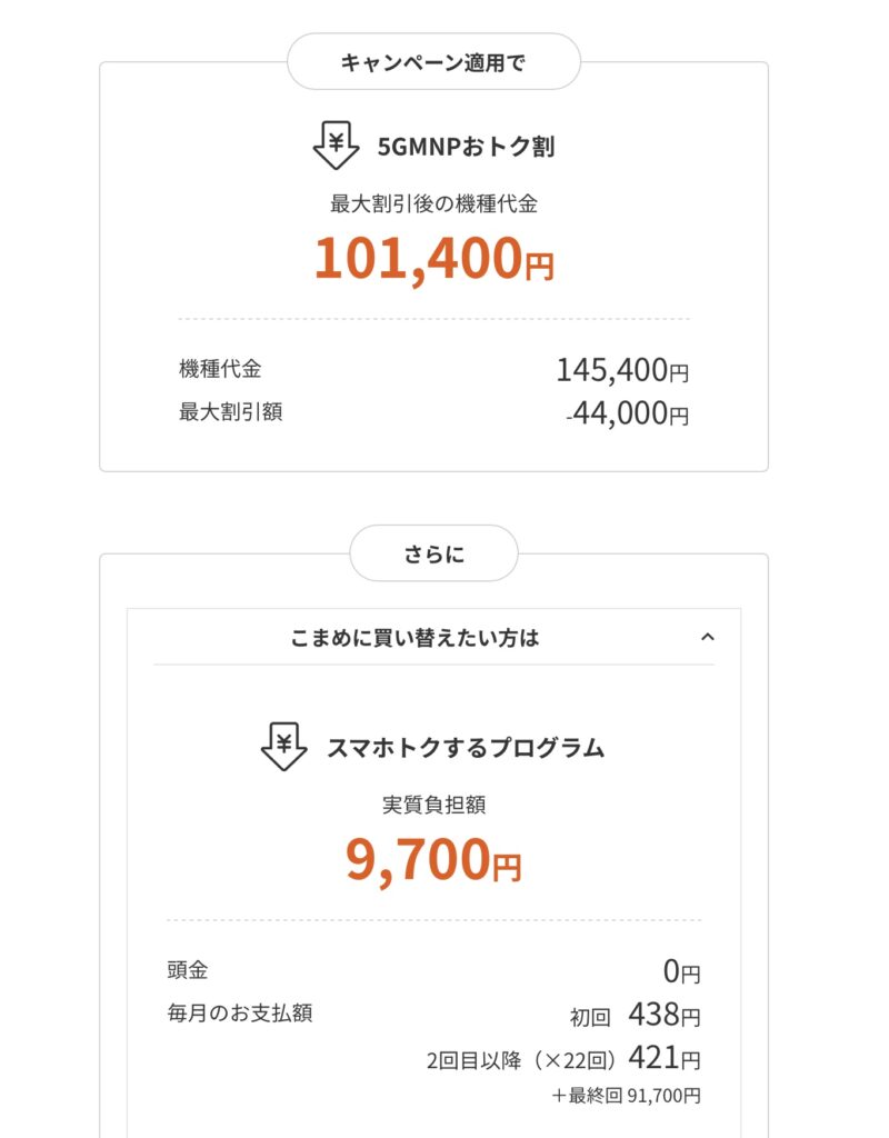 他社からの乗り換え(MNP)で、端末購入プログラムを利用した場合の価格がポイントです。