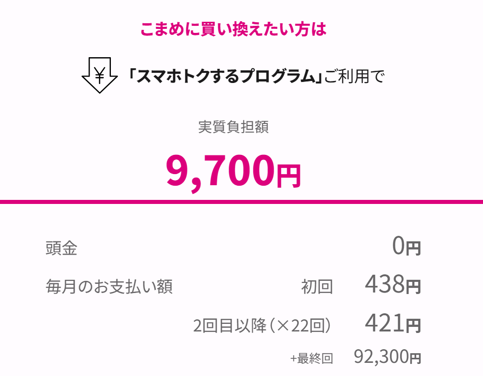 Apple直販で一括購入すると約18万円ですが、ドコモのプログラムならプログラム利用料込みでも82,060円。