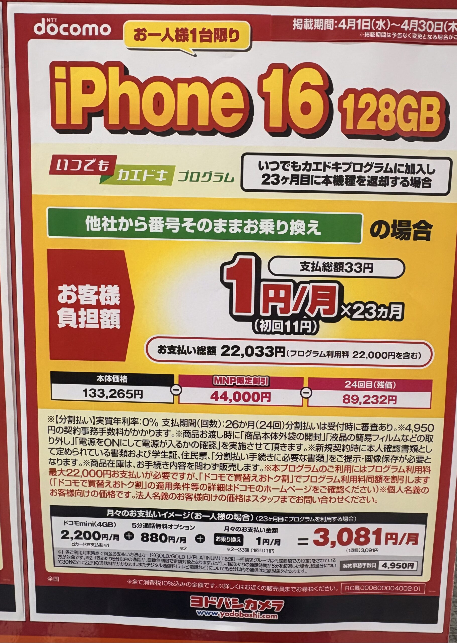 ![]() ドコモ(ahamo) | 33円 (22,033円) | 109,065円 | 注意:要 次回購入 ※ |