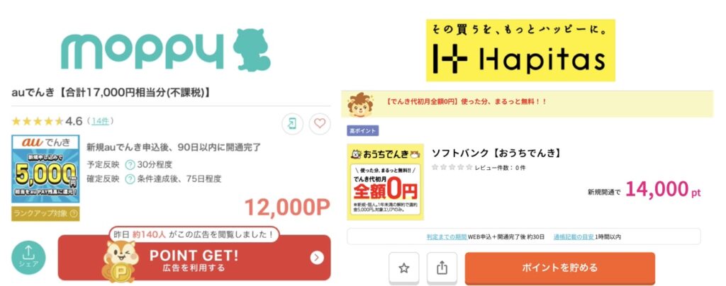 「モッピー」や「ハピタス」などのポイントサイトを経由して電力会社を申し込むと、10,000〜14,000ポイントほどの独自還元が貰える場合があります。