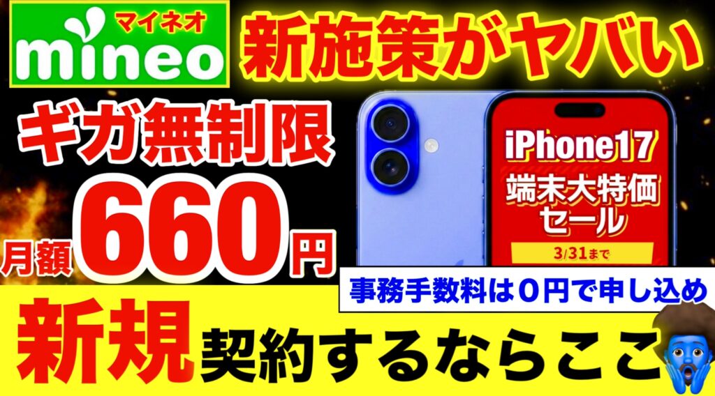 📌 〜3GB:mineo(キャンペーン660円) が事務手数料無料でコスパ最強🏆