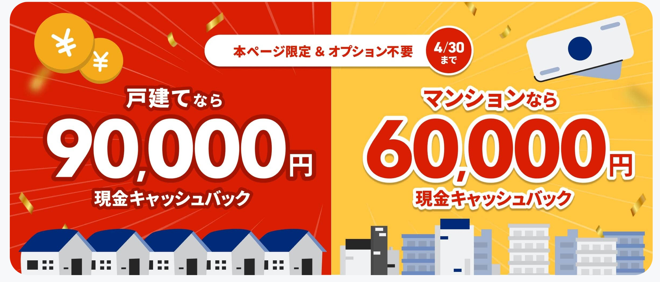 現金キャッシュバック:戸建90,000円/マンション60,000円に。オプションキャッシュバック:最大60,000円