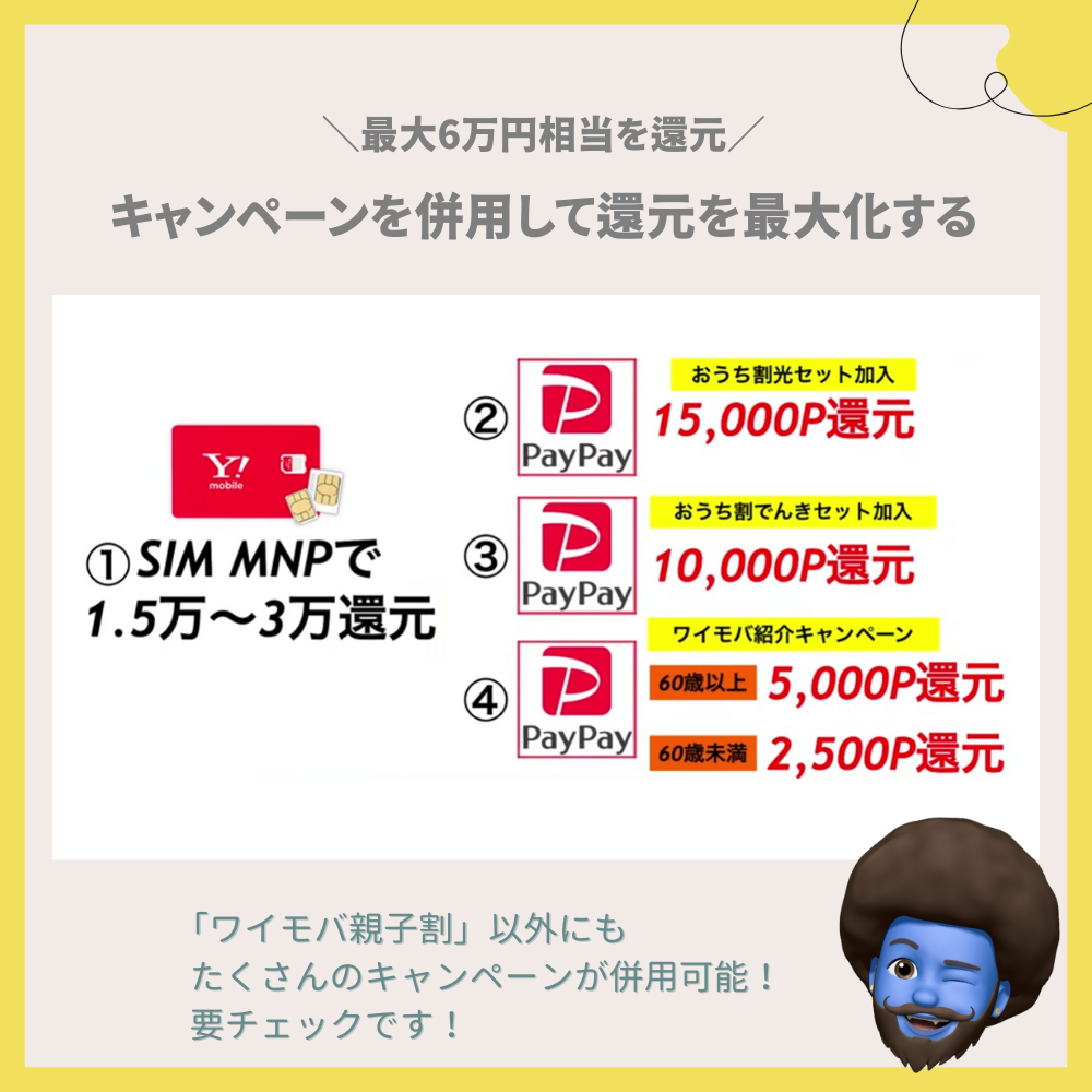 ワイモバ親子割だけでも月々の支払いは安くなりますが、現在開催中の他のキャンペーンと組み合わせることで、さらにお得になります。