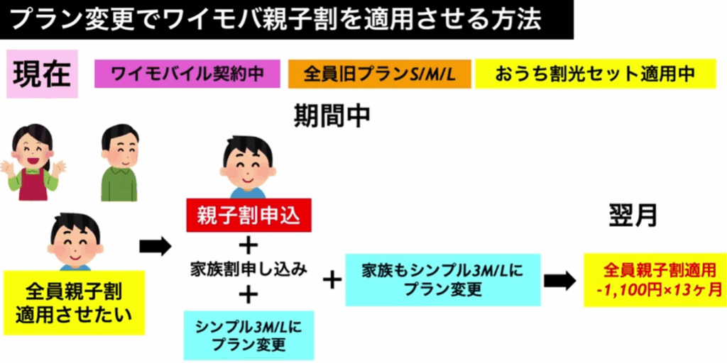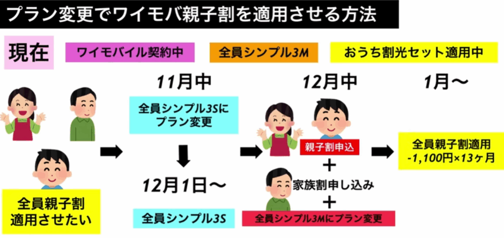 ・同月内に「ワイモバ親子割」と「家族割引サービス(未加入の場合)」を申し込む。